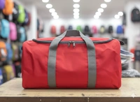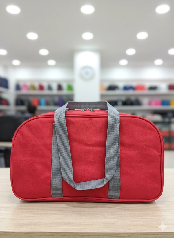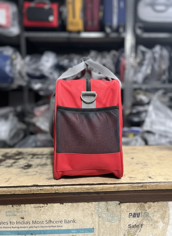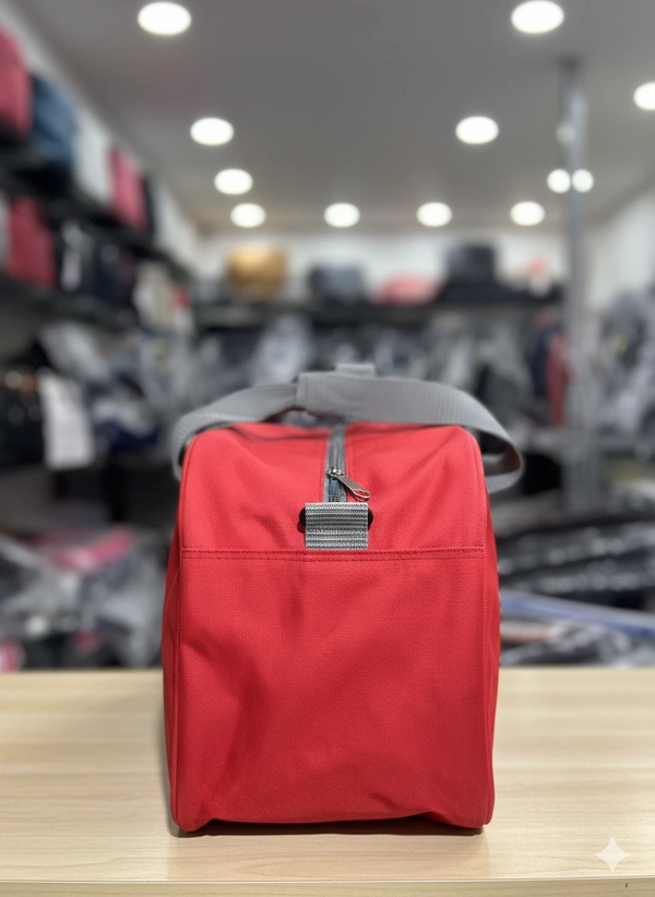 Design & Color: Sporty, barrel-shaped duffel bag in a primary Red color with a Black front panel and Grey handles/straps.