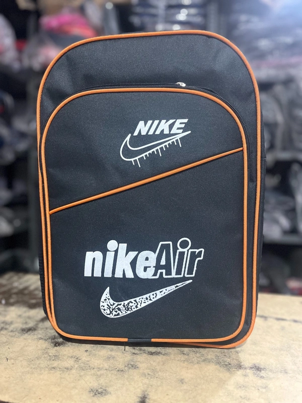 This Nike-Branded Multi-Pocket Backpack is a practical and stylish bag designed for students, athletes, and commuters. Featuring a classic black canvas body with striking white piping, it combines a retro aesthetic with modern functionality. The front face showcases bold "Nike Air" graphics and stylized Swoosh logos, giving it a high-energy, athletic look.