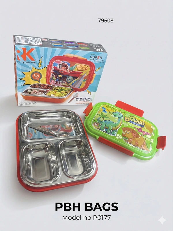 PBH BAGS Kids Lunch Box (Model P0177) – RK Plastoware Unique King 3 | 3-Compartment Stainless Steel Insulated Tiffin with Spoon