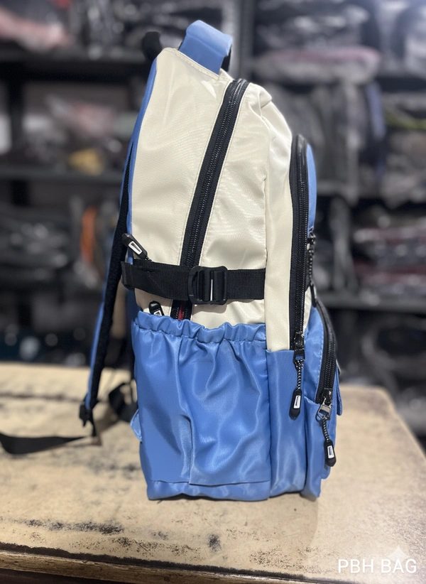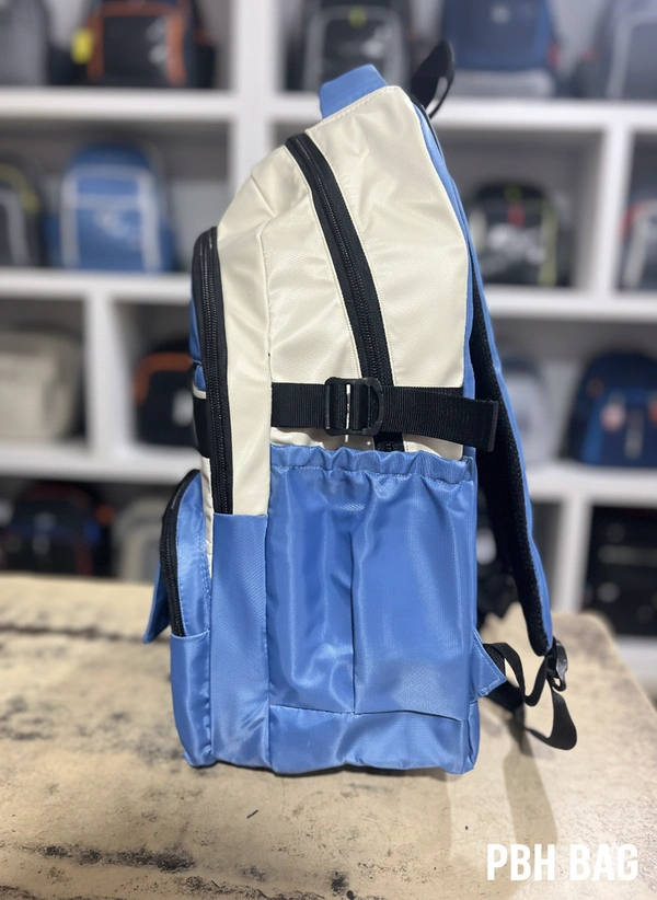 This is a stylish and functional multi-compartment backpack designed with a contemporary "streetwear" aesthetic. It features a striking two-tone Cornflower Blue and Cream color scheme, perfect for students, commuters, or casual travelers.