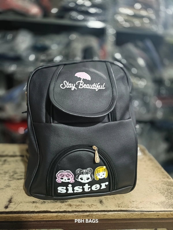 • Front Zipper Pocket: The lower front has a half-circle zippered pocket with a patch featuring three cartoon girls and the word "SISTER" embroidered below them.