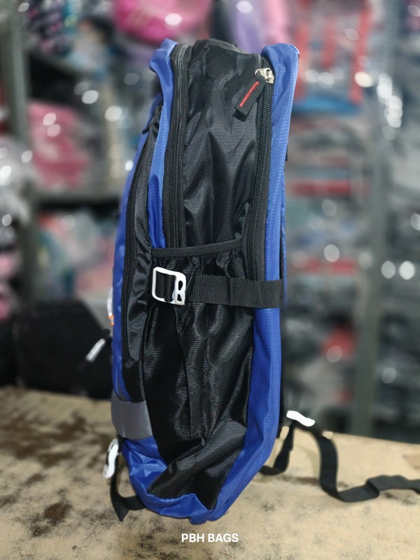 Adjustable Shoulder Straps: Features padded black and blue shoulder straps with breathable mesh lining. They are fully adjustable with durable white plastic buckles.