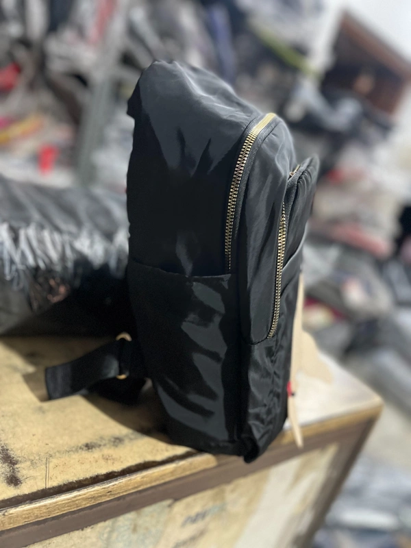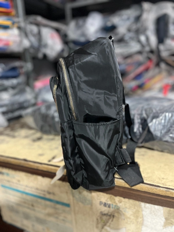 Zippers: It features metallic-colored (likely gold-tone) zippers which provide a subtle contrast against the black fabric.