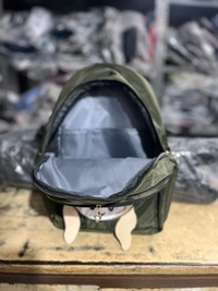 Main Compartment: Spacious for a mini-backpack, secured with a top zipper ). The interior lining is a contrasting light gray or silver fabric.