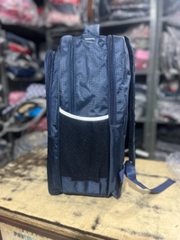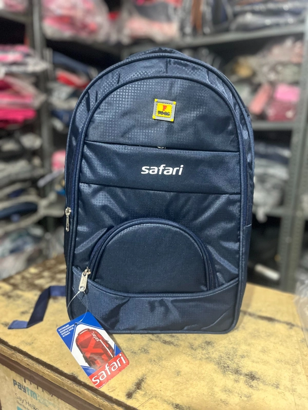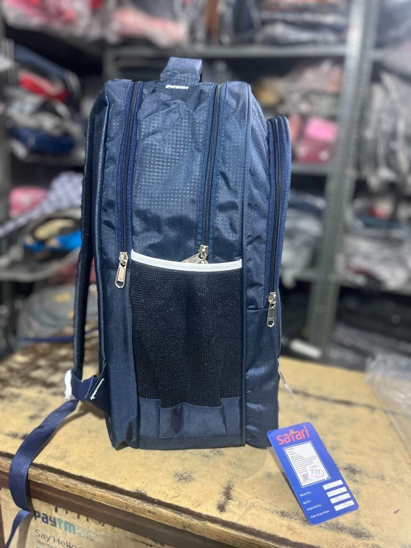 This Safari backpack is designed for those who need a blend of durability and high-capacity storage. Featuring a sleek navy blue finish with a subtle textured micro-grid pattern, it is built to withstand the rigors of daily commuting, school, or short travel trips. Its standout feature is the "Extreme Suspension" shoulder strap system, designed to redistribute weight and reduce strain on your back.