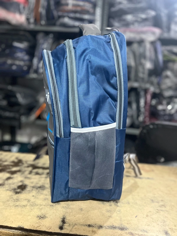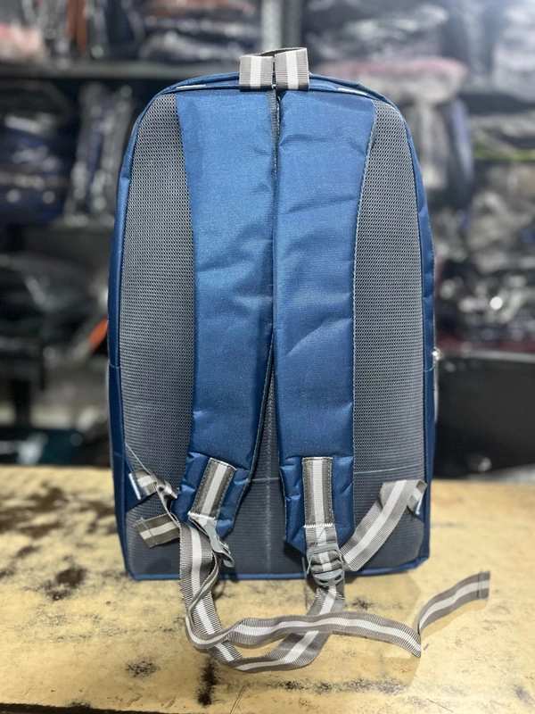 Color Scheme: Navy blue body with contrasting grey panels and striped grey/white webbing.