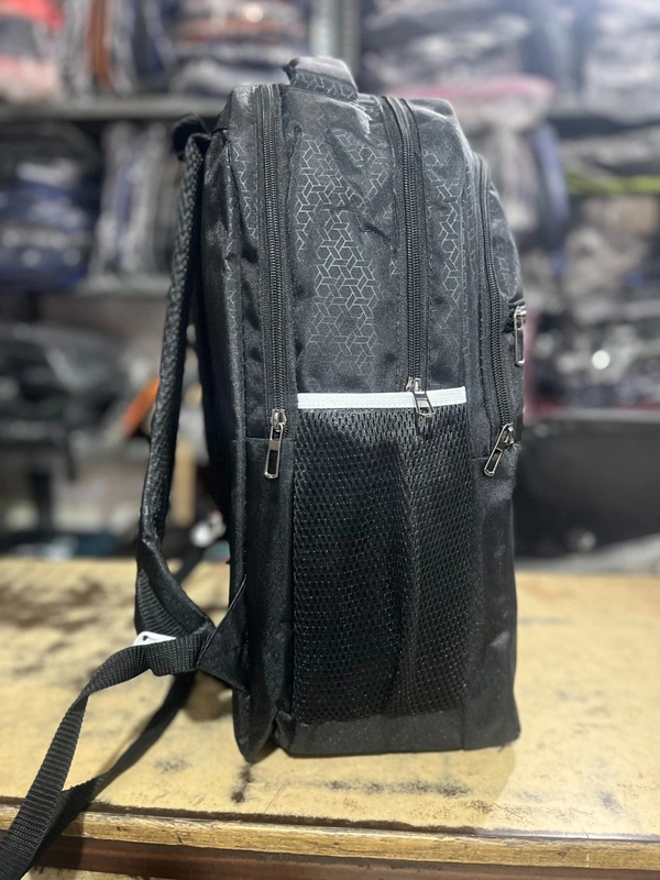 This sleek, charcoal grey backpack combines a professional aesthetic with rugged functionality. Designed for students, commuters, and day-travelers, it features a multi-compartment layout and durable synthetic fabric with a distinctive geometric hexagonal pattern on the upper panel.